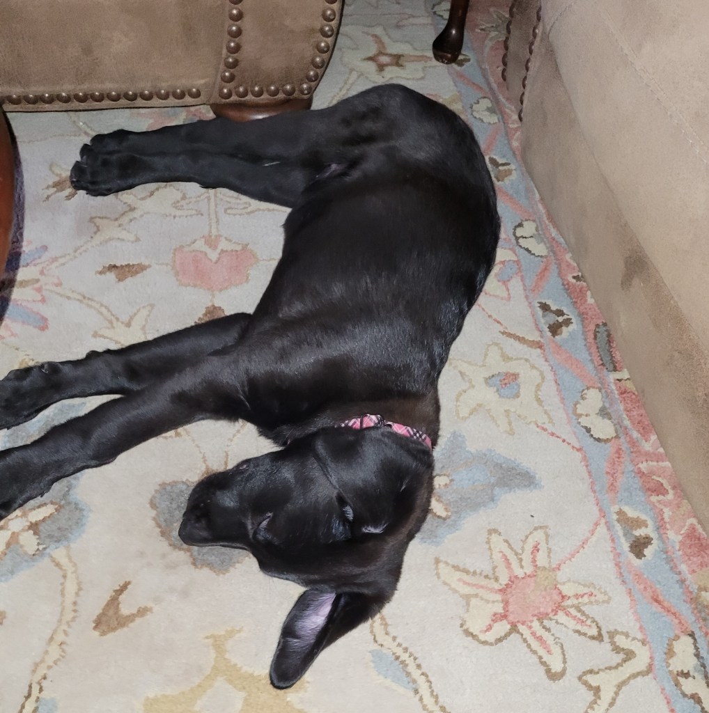 When I brought Dixie home, the first day was pretty easy. She slept. Then she slept some more. When she finished her nap, she walked around for a few minutes and then plopped on the floor and slept some more. This, of course, was sprinkled with many trips outside for her to pee and poop.